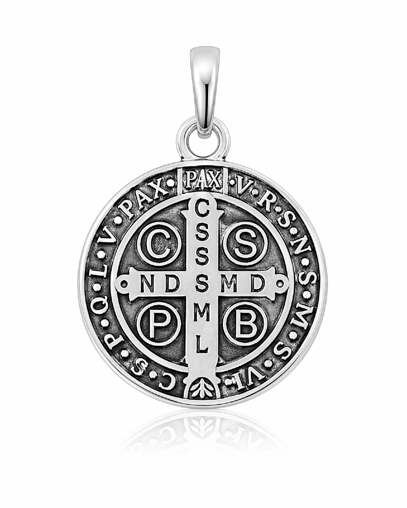 Dwustronny medal Św. Benedykta wykonany ze srebra najwyższej jakości, próba 925. Dodatkowo oksydowany co chroni przed korozją; poprzez pokrycie powierzchni srebra cienką warstwą tlenku srebra. Oksydowanie pełni również funkcję ozdobną. Precyzyjnie wykonany z dbałością o detale produkt polski.
