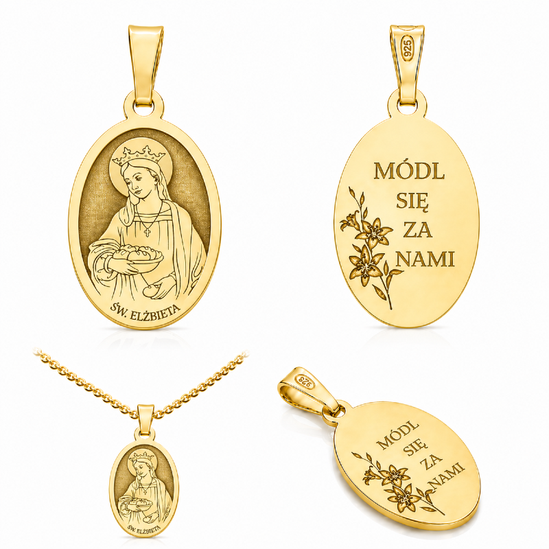 Elegancki medalik srebrny pozłacany próby 925 z wizerunkiem Świętej Elżbiety, patronki matek, żon i położnych. To wyjątkowy dewocjonalny dodatek o głębokim znaczeniu duchowym, łączący ponadczasowe piękno z symboliką wiary.