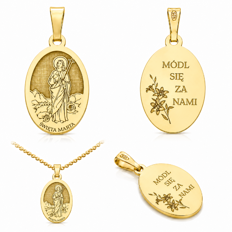 Wizerunek Świętej Marty podkreśla duchowy charakter biżuterii, czyniąc ją nie tylko ozdobą, ale również osobistym symbolem opieki i wsparcia. Dzięki kompaktowym wymiarom i lekkiej wadze medalik jest wygodny w noszeniu.