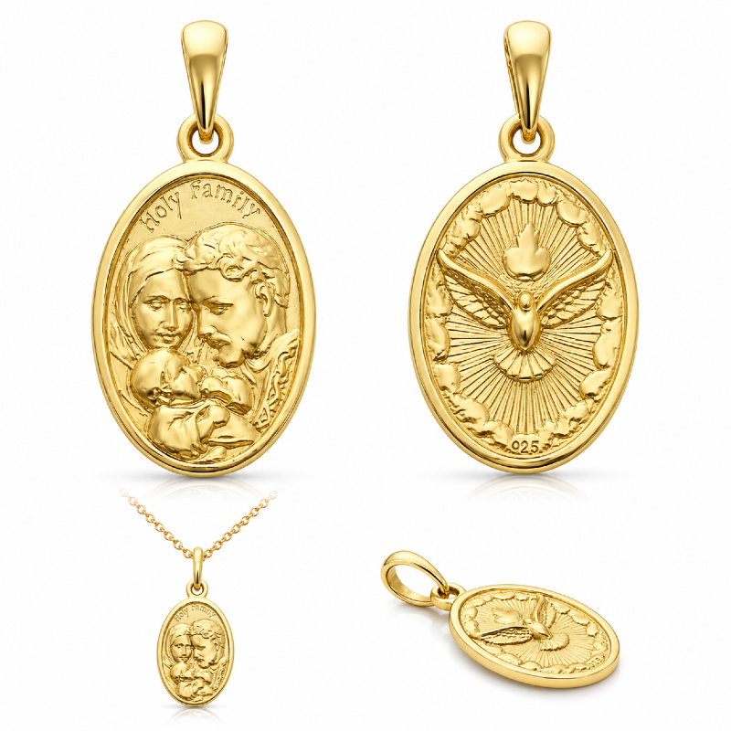Pozłacany medalik Święta Rodzina doskonale sprawdzi się jako religijny upominek z okazji chrztu świętego, Pierwszej Komunii Świętej, bierzmowania czy jako wyjątkowa pamiątka dla bliskiej osoby. Staranność wykonania oraz subtelne zdobienia czynią go nie tylko wyrazem duchowości, ale również elegancką biżuterią o symbolicznym znaczeniu.