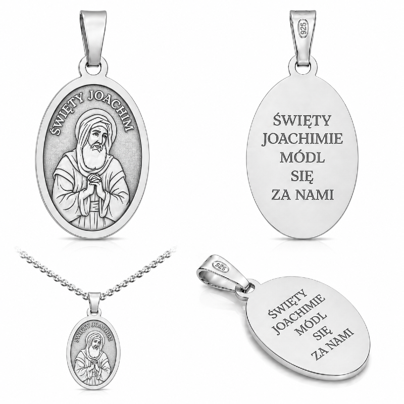 Elegancki medalik przedstawiający Święty Joachim, według tradycji chrześcijańskiej ojca Najświętszej Maryi Panny, a tym samym dziadka Jezusa Chrystusa. Czczony wraz ze swoją małżonką, Święta Anna, od wieków uznawany jest za szczególnego patrona rodzin, małżeństw, ojców, dziadków oraz osób starszych. Jego wstawiennictwu powierzane są sprawy życia rodzinnego, jedności małżeńskiej oraz opieki nad najbliższymi.