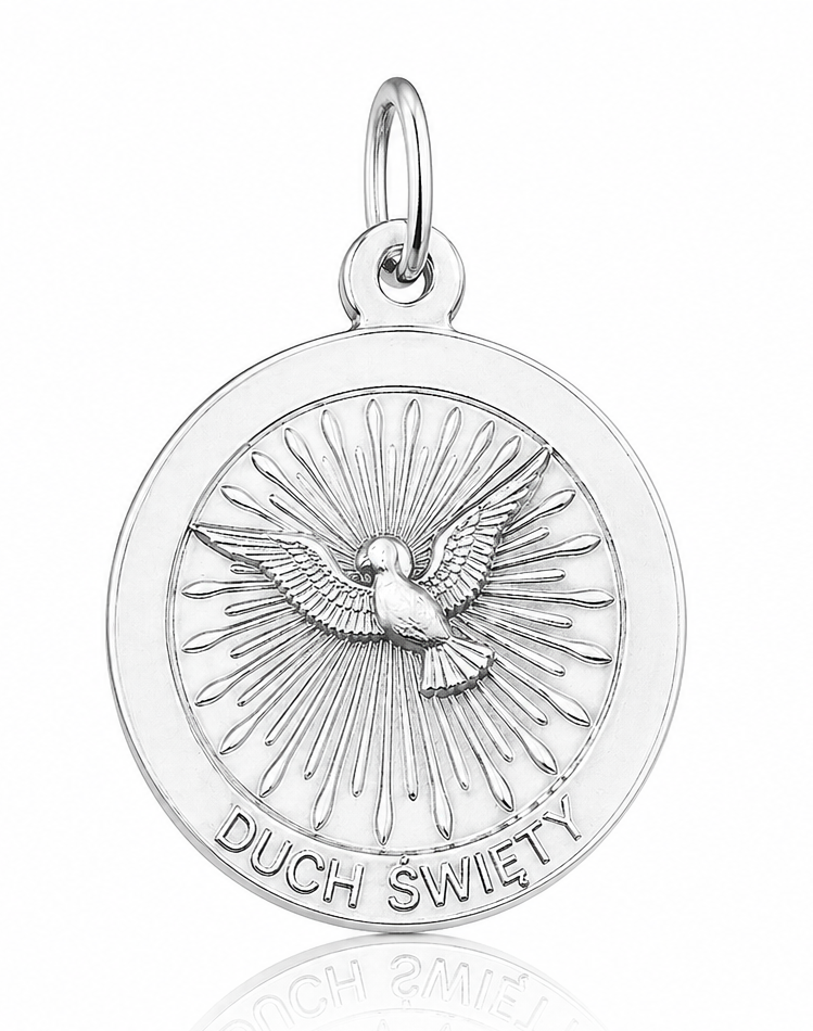 Starannie i precyzyjnie wykonany medalik ze srebra o najwyższej próbie srebra 925. Dopracowany w każdym szczególe, z uwzględnieniem najmniejszego detalu. Z jednej strony medalika znajduje się wizerunek gołębicy - Ducha Świętego, a z drugiej umieszczony jest wizerunek Pana Jezusa, Matki Bożej i Boga Ojca.