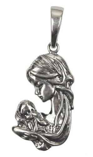 Maryja z dzieciątkiem w formie medalika ze srebra.