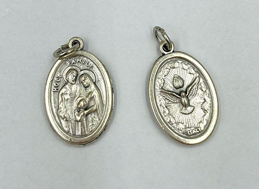 Medalik z wizerunkiem św. Rodzina/Duch Święty; wykonany z metalu dwustronny.
