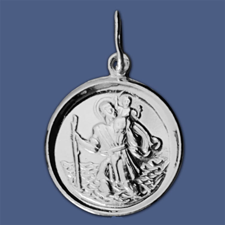 Medalik ze srebra o próbie 925 z wizerunkiem św. Krzysztofa niosącego Pana Jezusa na ramieniu.