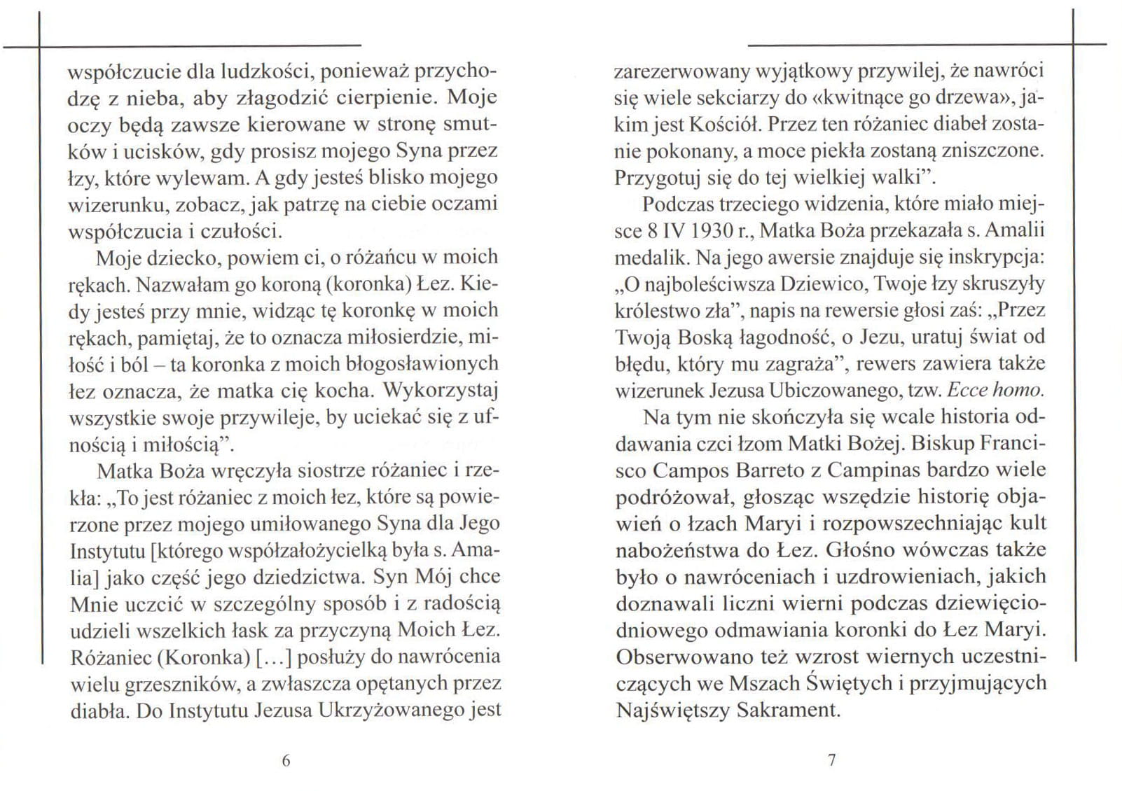 Widzenie o siedmiu łzach Maryi miała s. Amalia, współzałożycielka Instytutu Misjonarek Jezusa Ukrzyżowanego w Campinas, w Brazylii 8 XI 1929 r. Objawił się jej Pan Jezus i podyktował Różaniec lub Koronkę do Siedmiu Łez Maryi. W tym objawieniu obecna również była Matka Boża, która powiedziała s. Amalii, że życzy sobie, by członkowie rodzin i klasztorów odmawiali ów różaniec każdego dnia o siódmej wieczorem. W dniu 15 V 1934 r. nabożeństwo do siedmiu łez Maryi zostało zatwierdzone przez Stolicę Apostolską.