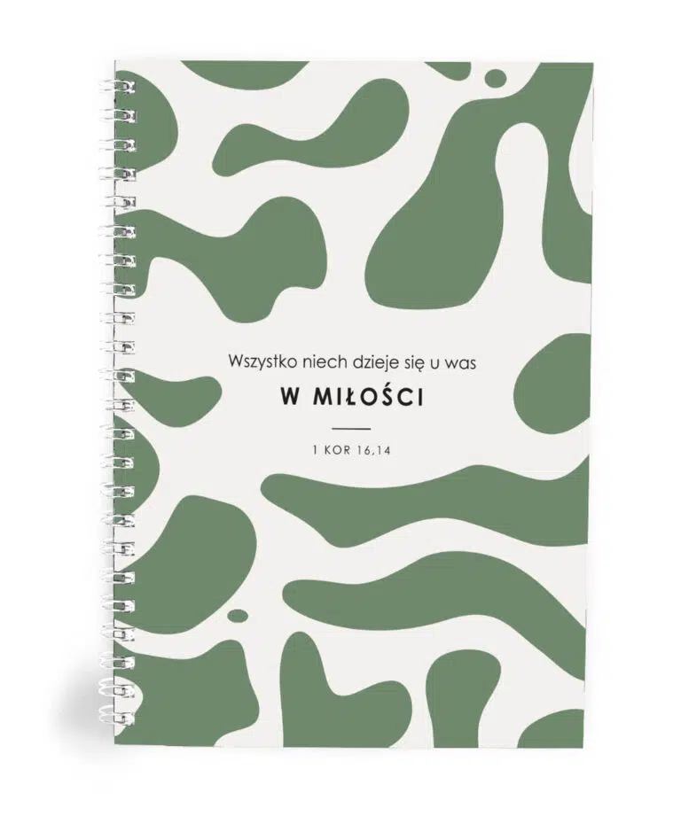 Szukasz notatnika, który przypomni Ci o znaczeniu miłości we wszystkim, co robisz? Mój dziennik „Wszystko Niech Się Dzieje – Kształty” to wyjątkowy notes, który będzie Twoim codziennym towarzyszem w drodze do życia pełnego miłości i troski o innych. Na okładce znajduje się inspirujący cytat z 1 Listu do Koryntian (1 Kor 16,14): „Wszystko niech się dzieje u was w miłości”. Abstrakcyjny wzór w zielonych odcieniach nadaje mu nowoczesnego charakteru, który wyróżnia się świeżością.