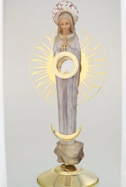 Monstrancja na figurze Maryi wykonanej z drewna. Autorsko rzeźbiona.