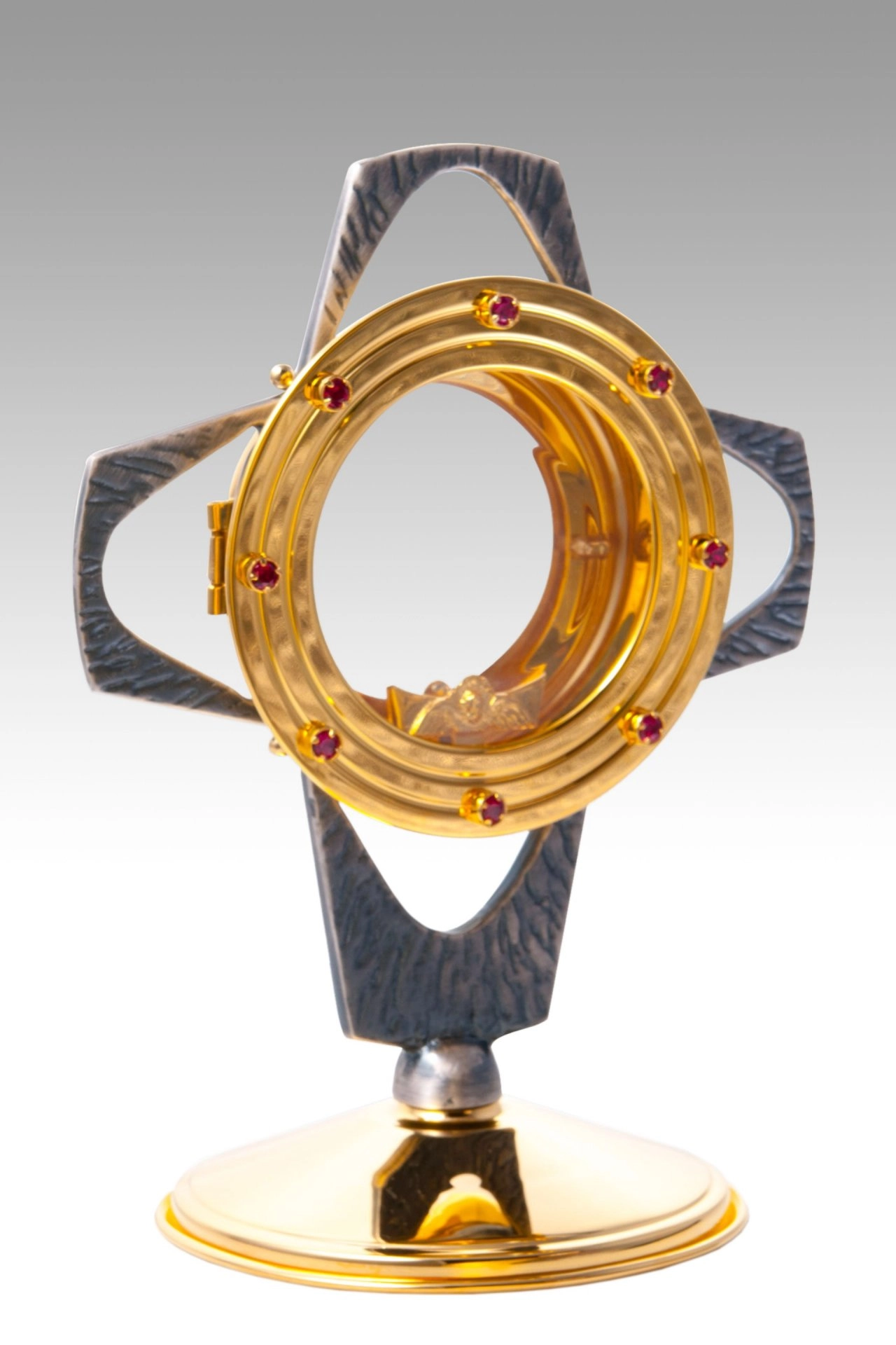 Zdobiona czerwonymi kamieniami półszlachetnymi monstrancja do kościoła.
