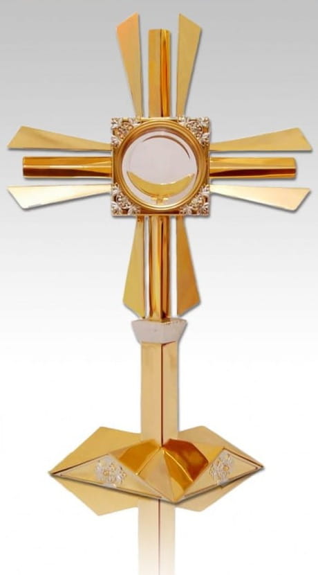 Monstrancja wykonana z pozłacanego mosiądzu, w kształcie krzyża