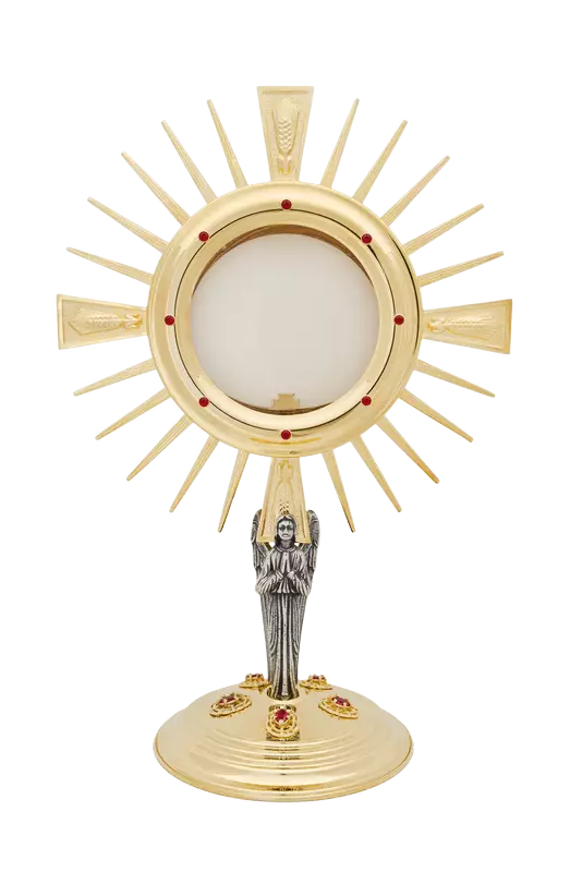 Monstrancja wykonana jest z mosiądzu, pozłacana. Postać anioła srebrzona, patynowana. Podstawa zdobiona rubinami.