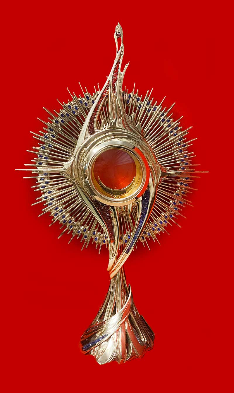 Monstrancja posiada transparentne nasypy szklane w prześwitach nawiązujące do "Miłosierdzia".