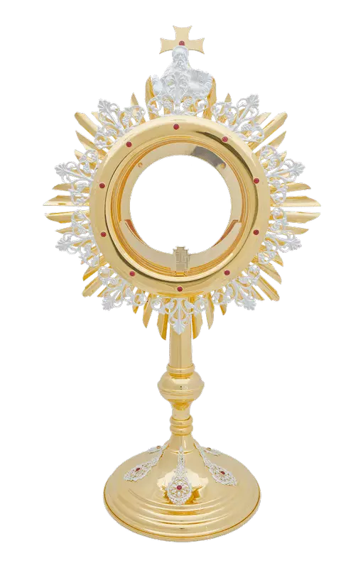 Pierścień przedni monstrancji zdobiony kamieniami.