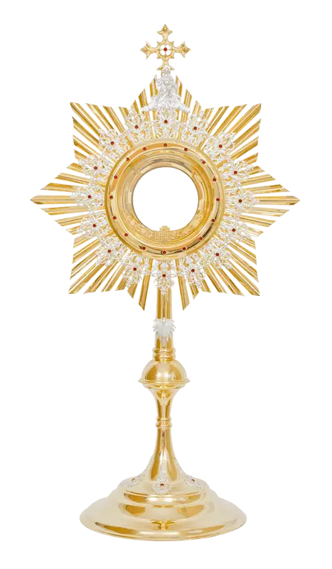 Pierścień przedni monstrancji oraz ornamenty podstawy zdobione rubinami.