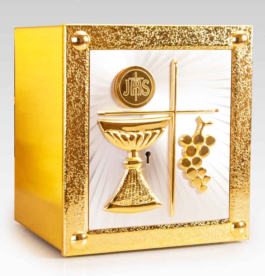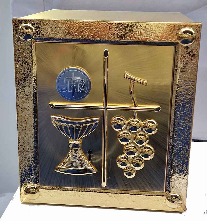 Dzwonki ołtarzowe średnie potrójne jednotonowe. Wyrób wykonany z odlewów mosiężnych , polerowany i lakierowany. Rączka dodatkowo chromowana (nie wymaga konserwacji ) Szerokość: 16,5 cm Wysokość: 14 cm