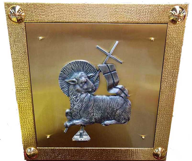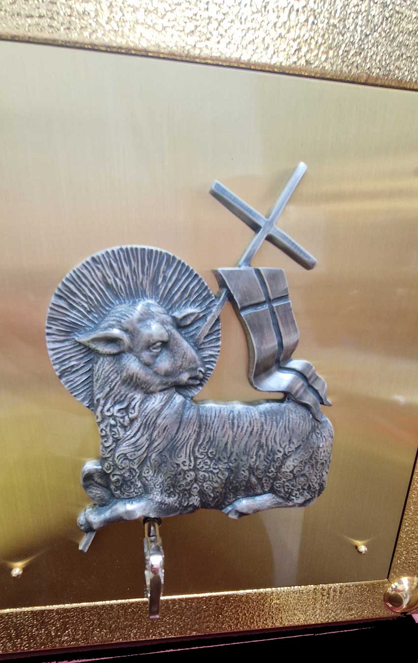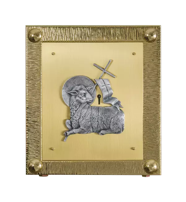 Mosiężne tabernakulum z metalowymi okuciami, zdobione motywem baranka.