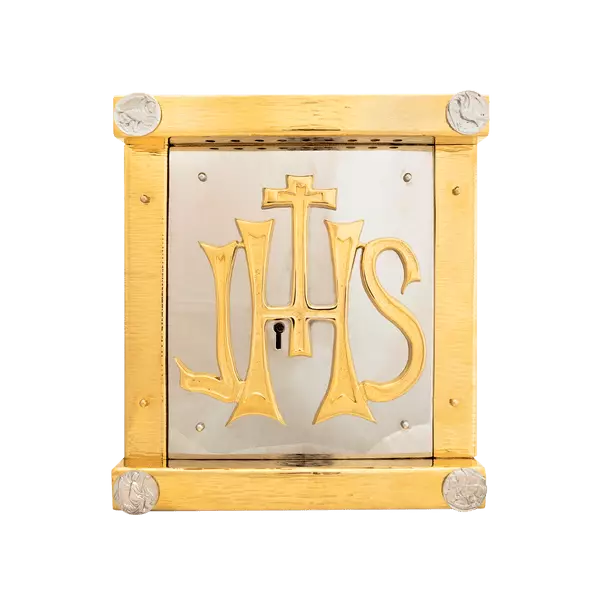 Tabernakulum mosiężne do kościoła z motywem IHS.