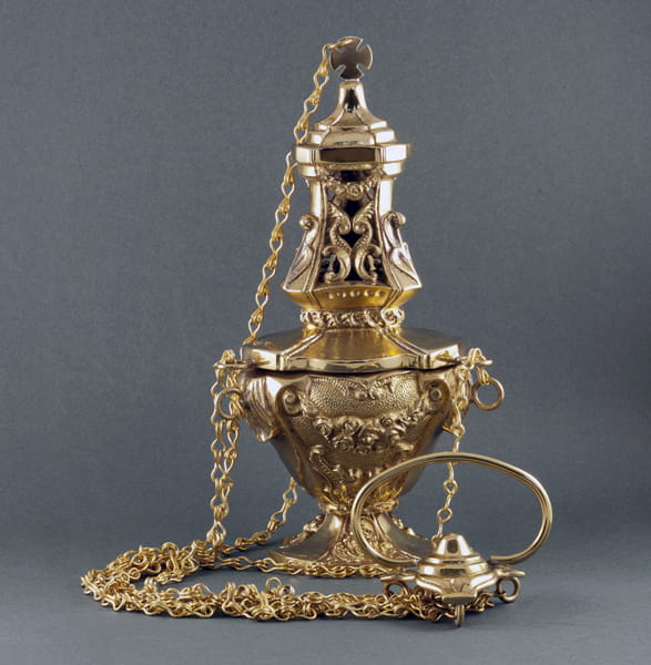 Kadzielnica mosiężna gotycka polerowana Wysokość: kadzielnicy: 29 cm Wysokość z łańcuszkami: 90 cm Kadzielnica dostępna także w wersji niklowanej (w kolorze srebrnym) w cenie 1050 zł