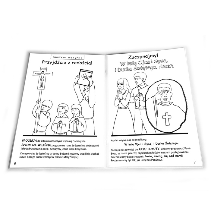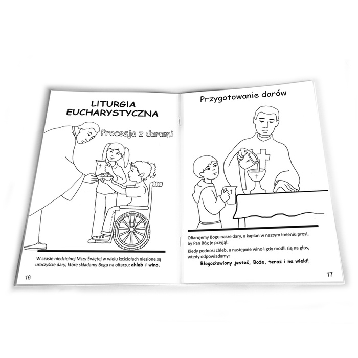 Kolorowanka opisuje w sposób przystępny i właściwy dla młodego czytelnika liturgię Mszy Świętej. Wyjaśnia poszczególne jej części. Bo czy zawsze uczestniczymy w niej świadomie? Dlaczego właściwie w niedzielę idziemy do kościoła i po co zbiera się tam tylu ludzi? Dlaczego kapłan się przebiera w szaty w różnych kolorach? Dlaczego słuchamy najpierw Pisma świętego? Czego kapłan używa celebrując Eucharystię? Co dzieje się na ołtarzu? Dzięki zabawie w kolory, literki, zgadywanki i labirynty przybliżanie tych treści staje się przyjemne a one same - łatwiejsze do zapamiętania.