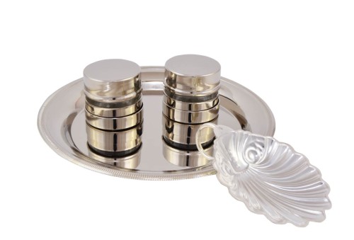 tacka, naczynka na oleje, muszla na wodę święconą, ręczniczek.