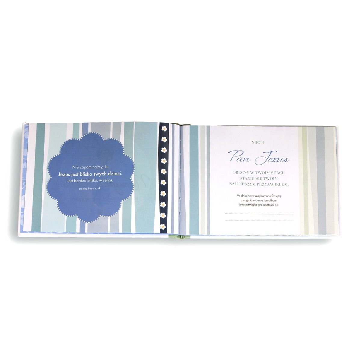Album sprawdzi się doskonale jako prezent lub dodatek do prezentu z okazji I Komunii Świętej. To nie tylko piękna pamiątka, do której będzie można wracać po latach, ale też wyjątkowe zaproszenie dla dziecka do przyjaźni z Panem Jezusem.
