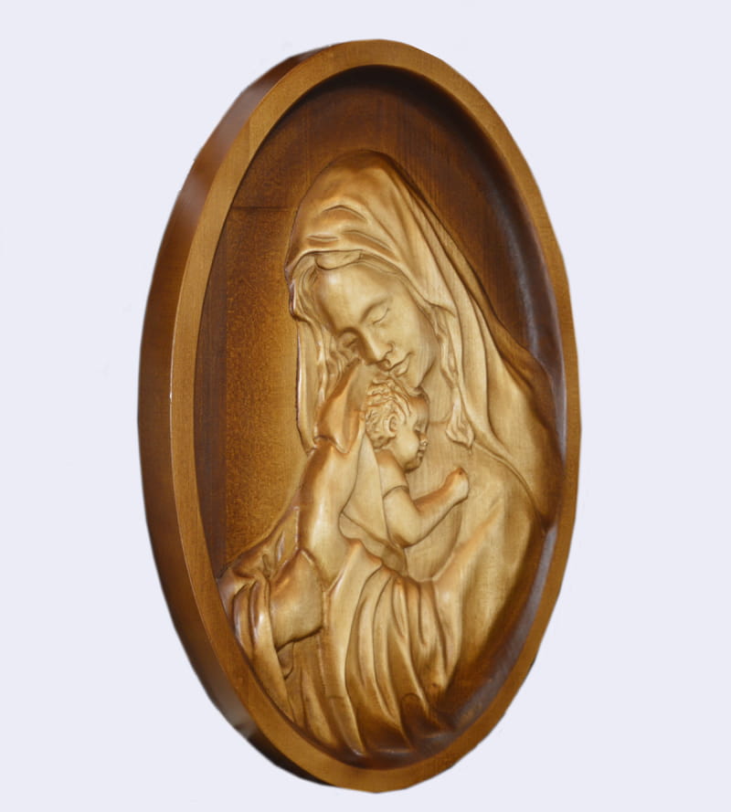 Obraz wykonany z drewna lipowego. Bejcowany oraz lakierowany z wizerunkiem Matki Bożej Karmiącej.