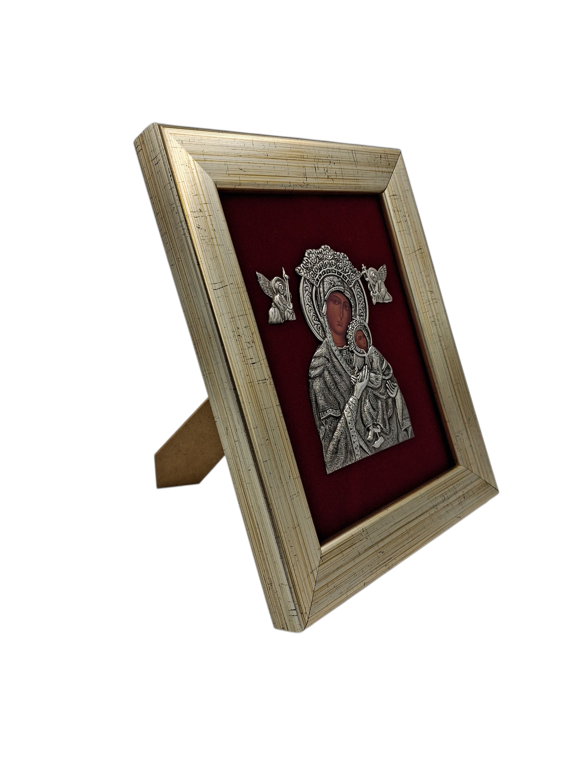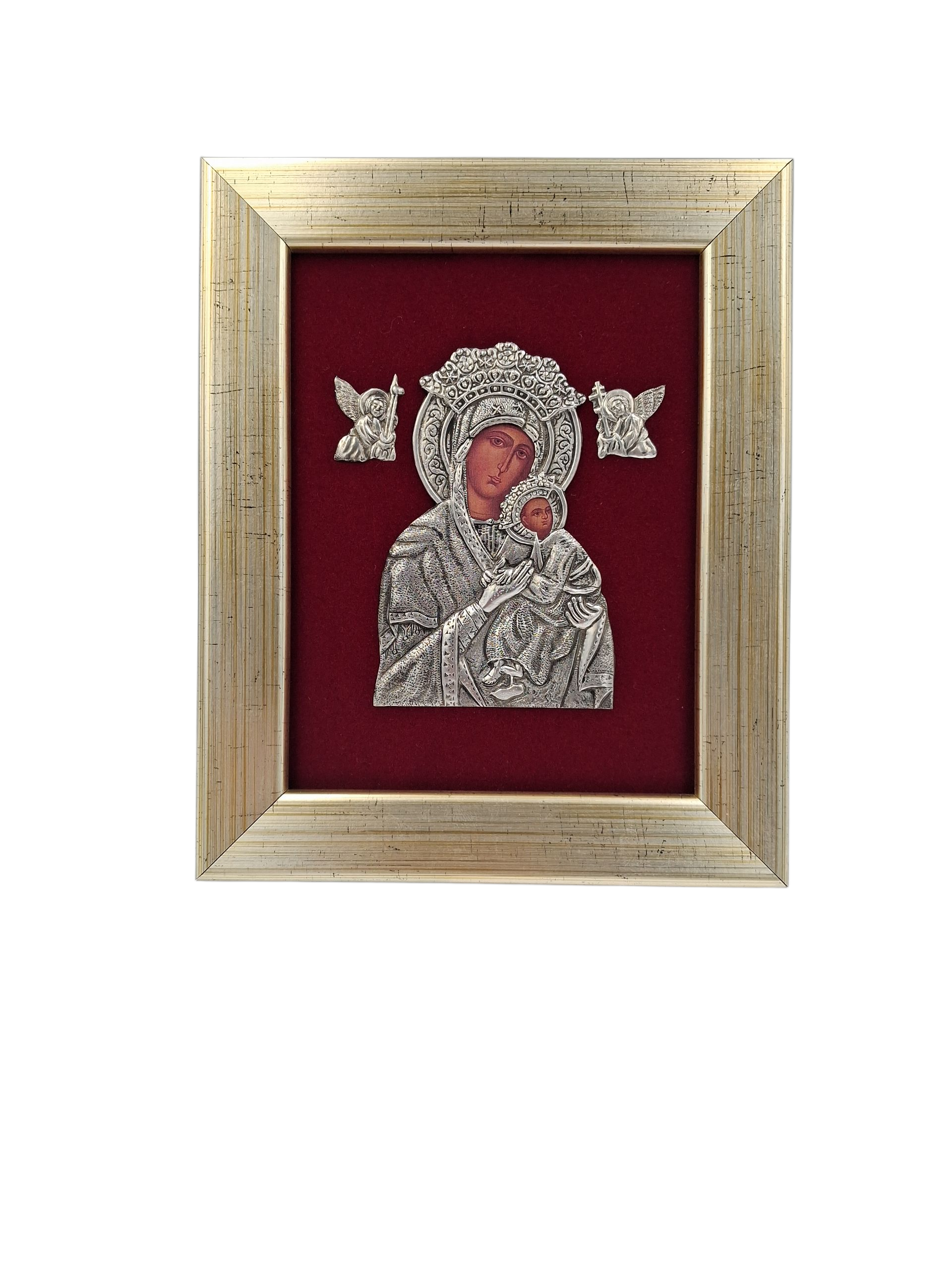 Wyjątkowej jakości obraz z wizerunkiem M.B. Nieustającej Pomocy na bordowym suknie w ramie drewnianej malowanej na kolor srebrny.