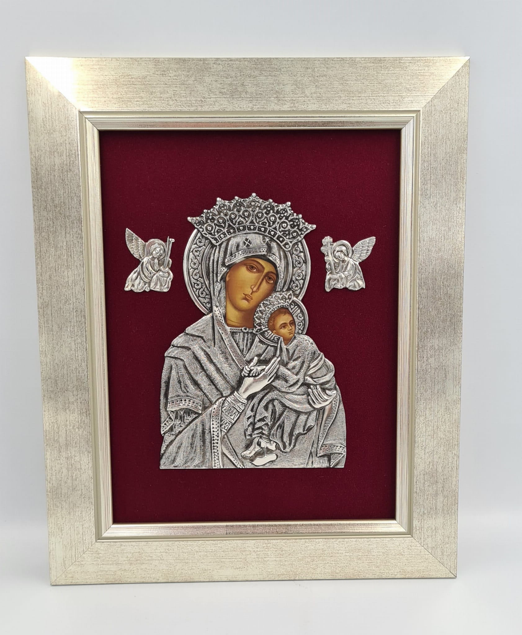 Wyjątkowej jakości obraz z wizerunkiem M.B. Nieustającej Pomocy na bordowym suknie w ramie drewnianej malowanej na kolor srebrny.