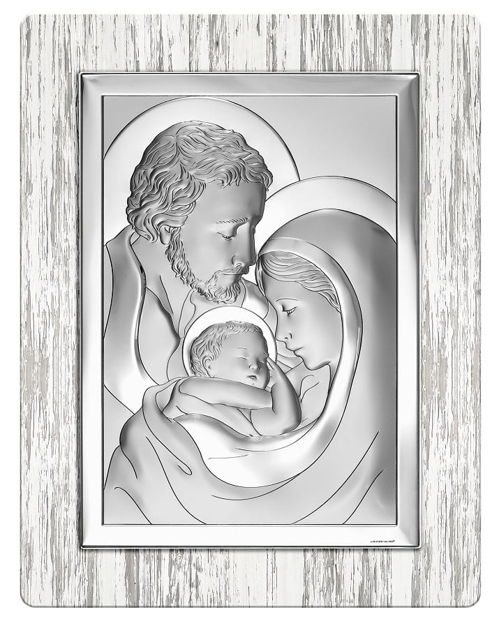 Posrebrzany wizerunek Przenajświętszej Rodziny na drewnie w stylu postarzonego drewna w kolorze bieli.
