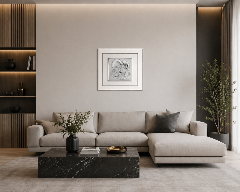 Elegancki obrazek posrebrzany przedstawiający Świętą Rodzinę – Maryję, Józefa i Dzieciątko Jezus – to wyjątkowa dekoracja o głębokim znaczeniu duchowym. Subtelna, reliefowa kompozycja została wykonana z dbałością o każdy detal, a srebrzone wykończenie nadaje całości szlachetnego i ponadczasowego charakteru.