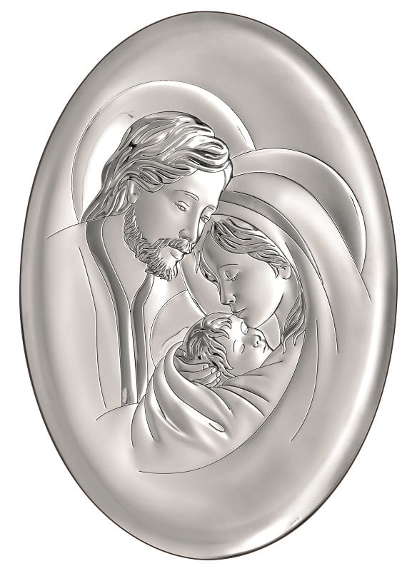 Wizerunek Świętej Rodziny laminowany srebrem najwyższej jakości, próba 925. Umieszczony trwale na drewnie w ciemnej kolorystyce. Obraz z możliwością postawienia i powieszenia (wyjmowana nóżka).