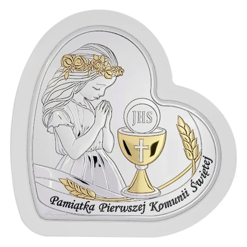 Elegancka pamiątka Pierwszej Komunii Świętej w kształcie serca to wyjątkowy upominek o głębokim znaczeniu duchowym. Przedstawia modlącą się dziewczynkę w wianku, obok kielicha eucharystycznego z hostią oznaczoną symbolem IHS – znakiem obecności Chrystusa. Subtelne złocenia nadają całości szlachetnego charakteru, podkreślając uroczysty wymiar tego sakramentu.