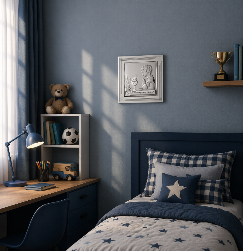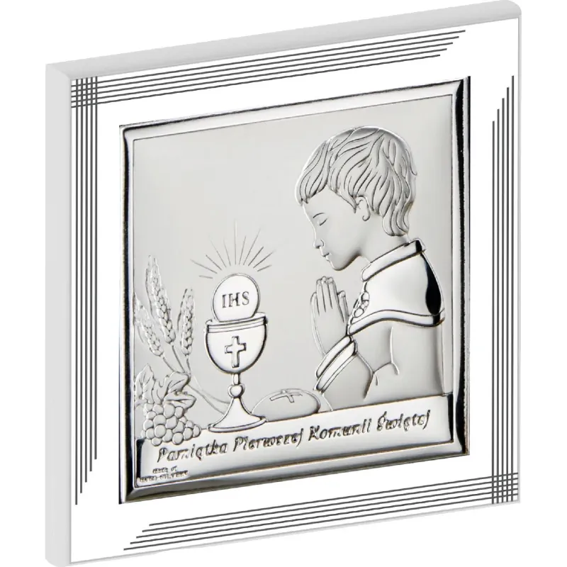 Elegancki obrazek srebrny przedstawiający modlącego się chłopca to wyjątkowa pamiątka Pierwszej Komunii Świętej. Wykonany z dbałością o detale, łączy klasyczną symbolikę religijną z nowoczesnym, minimalistycznym designem.