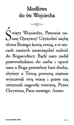 Na rewersie znajduje się modlitwa do św. Wojciecha, prosząca o wstawiennictwo, umocnienie wiary oraz pomoc w drodze do zbawienia. Tekst modlitwy czyni obrazek doskonałą pomocą modlitewną zarówno do użytku osobistego, jak i wspólnotowego.