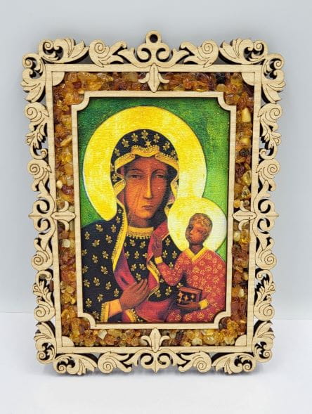 Obraz ze sklejki drewnianej z kolorowym wizerunkiem M.B. Częstochowskiej dodatkowo ozdobiony bursztynem.