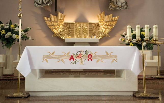 Obrus na ołtarz z czerwonym haftem Alfa i Omega. Obrus wykonany z tkaniny poliestrowej plamoodpornej.