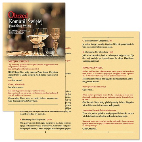 Formularze i wybór modlitw pomocnych kapłanom podczas obrzędu Komunii św. udzielanej poza Mszą św. Przejrzysty i czytelny druk. Wykonane na papierze kredowym, foliwanym dzięki temu bardzo trwałe.