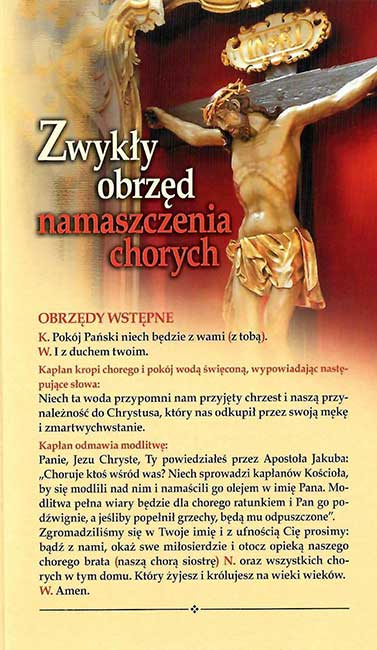 Formularze i wybór modlitw pomocnych kapłanom podczas obrzędu namaszczenia chorych. Przejrzysty i czytelny druk. Wykonany na papierze kredowanym, foliowanym dzięki temu jest bardzo trwały.