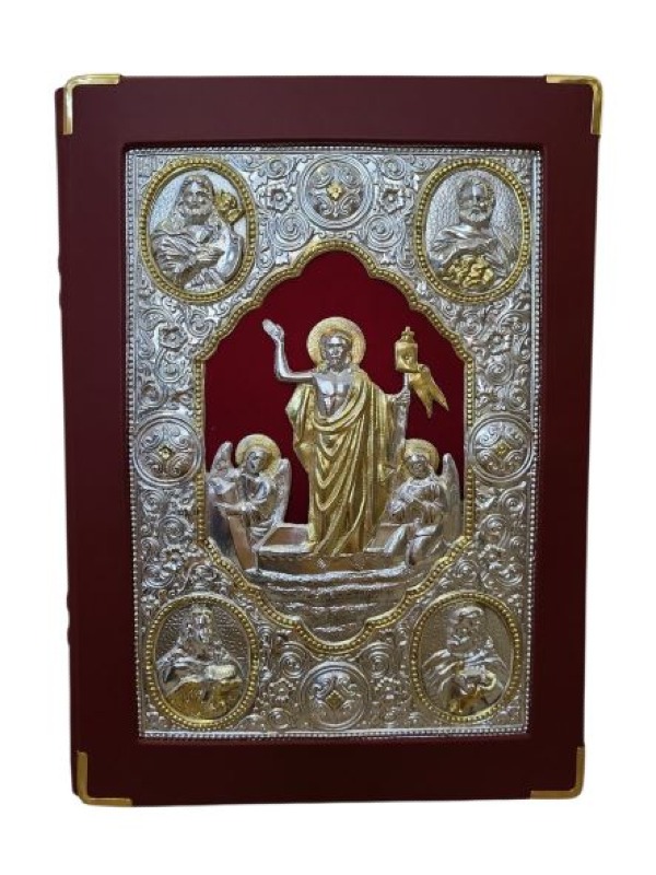 Skórzana okładka na Ewangeliarz z przodu Chrystus Zmartwychwstały, a z tyłu haftowany Krzyż Jerozolimski.