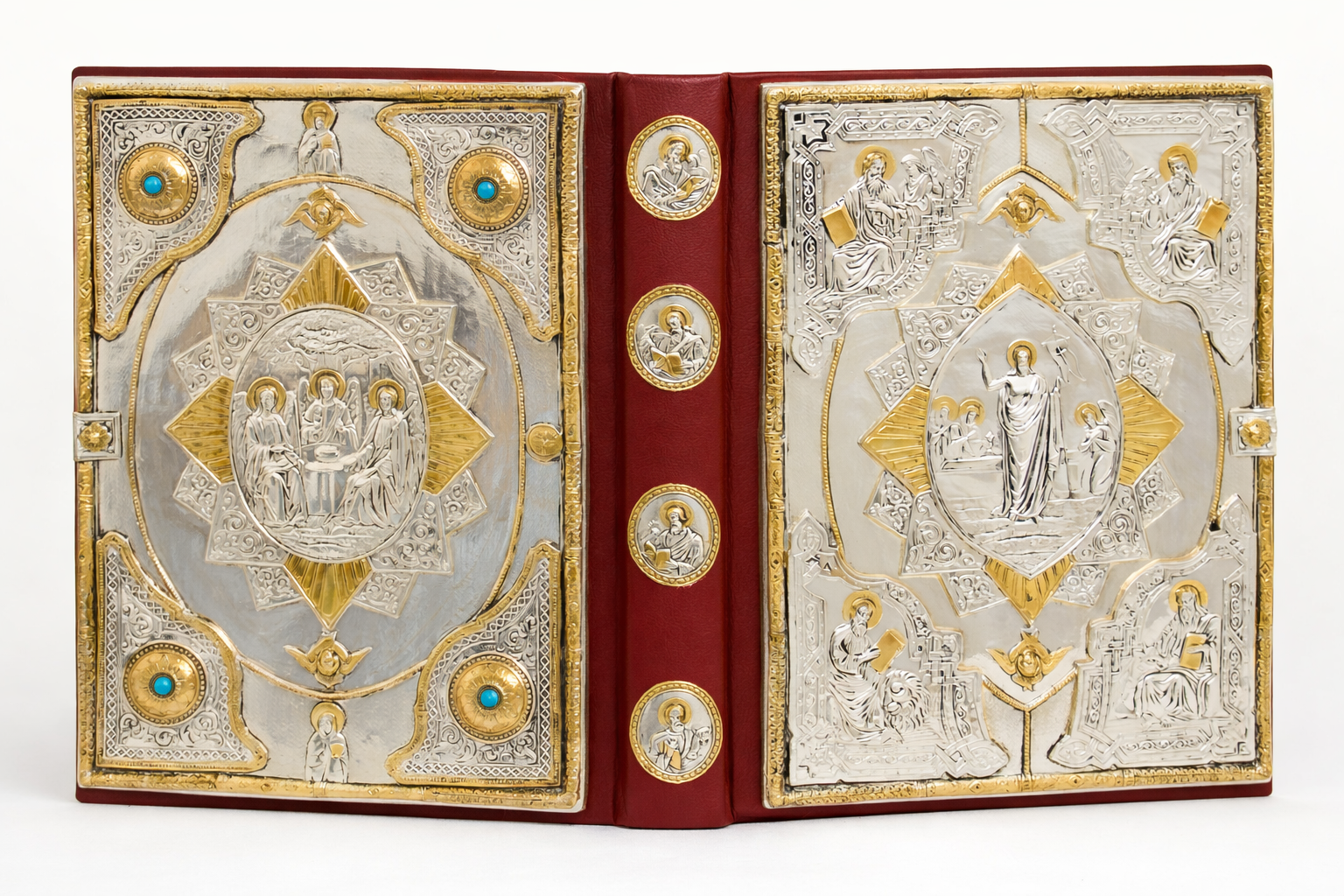 Okładka na Ewangeliarz ze skóry: z przodu: duża ikona - wykonana z miedzi posrebrzana i pozłacana - Chrystusa Zmartwychwstałego z tyłu: duża ikona - wykonana z miedzi posrebrzana i pozłacana - Jezusa na Krzyżu.