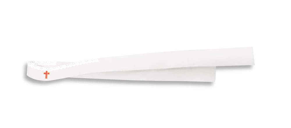 W komplecie z ornatem stuła w kolorze białym z haftowanym krzyżem.