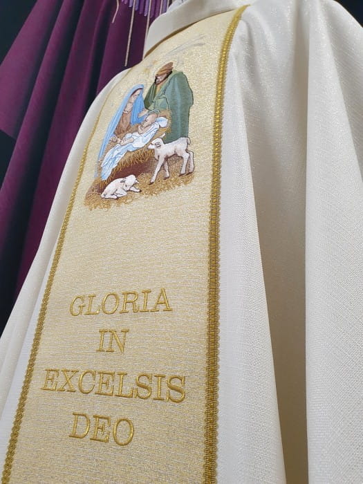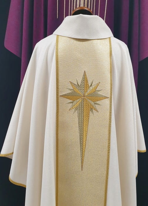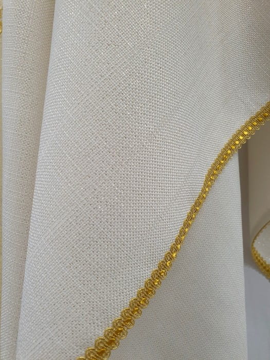 Ornat z tkaniny syntetycznej ze złotą lamówką.