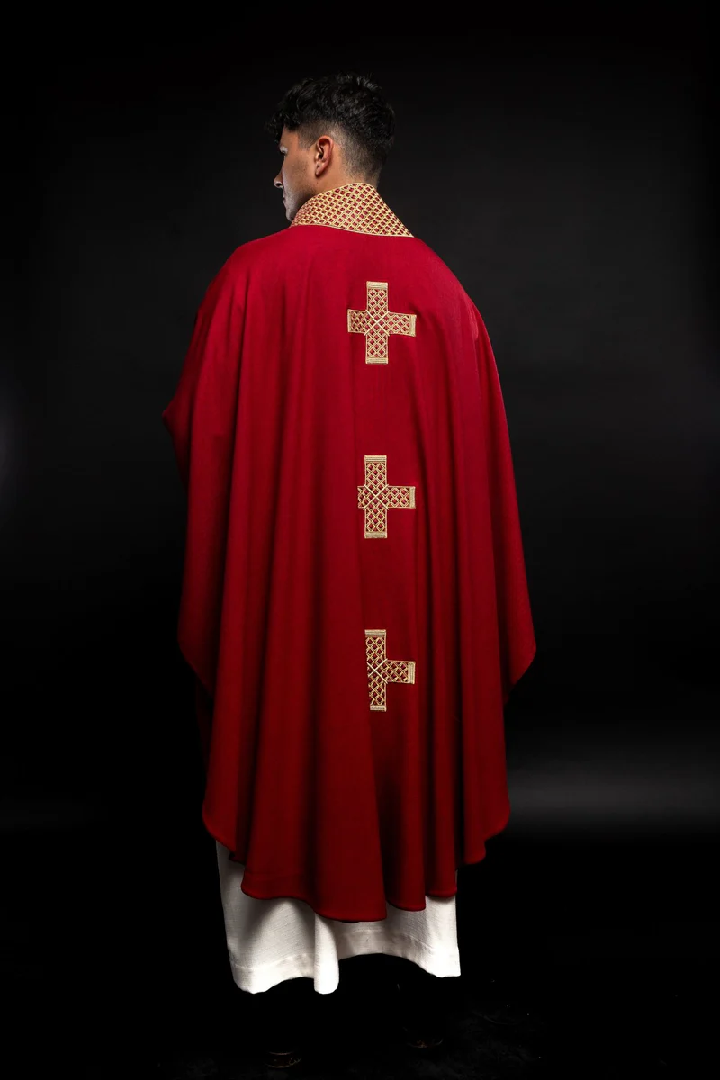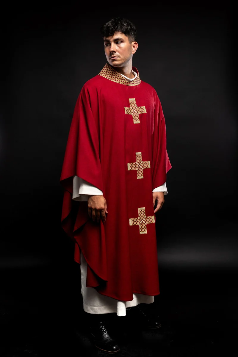 Nasz ornat, mistrzowsko wykonany z wysokiej jakości tkaniny, jest uosobieniem elegancji i głębokiego symbolizmu liturgicznego. Zdobiony w haftowane złote krzyże i kołnierz w kolorze czerwonym, nasz ornat emanuje majestatem i pięknem.