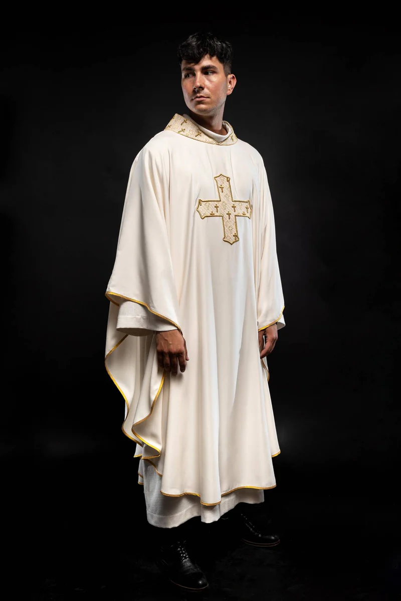 Ornat ecru z bogato haftowanym krzyżem