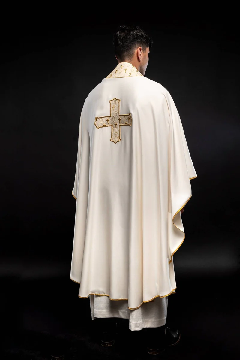 Ornat wykonany z wysokiej jakości tkaniny gładkiej, zdobiony krzyżami.