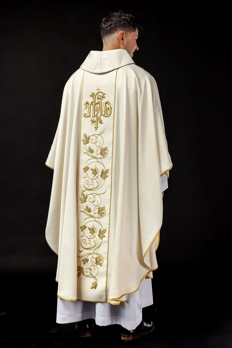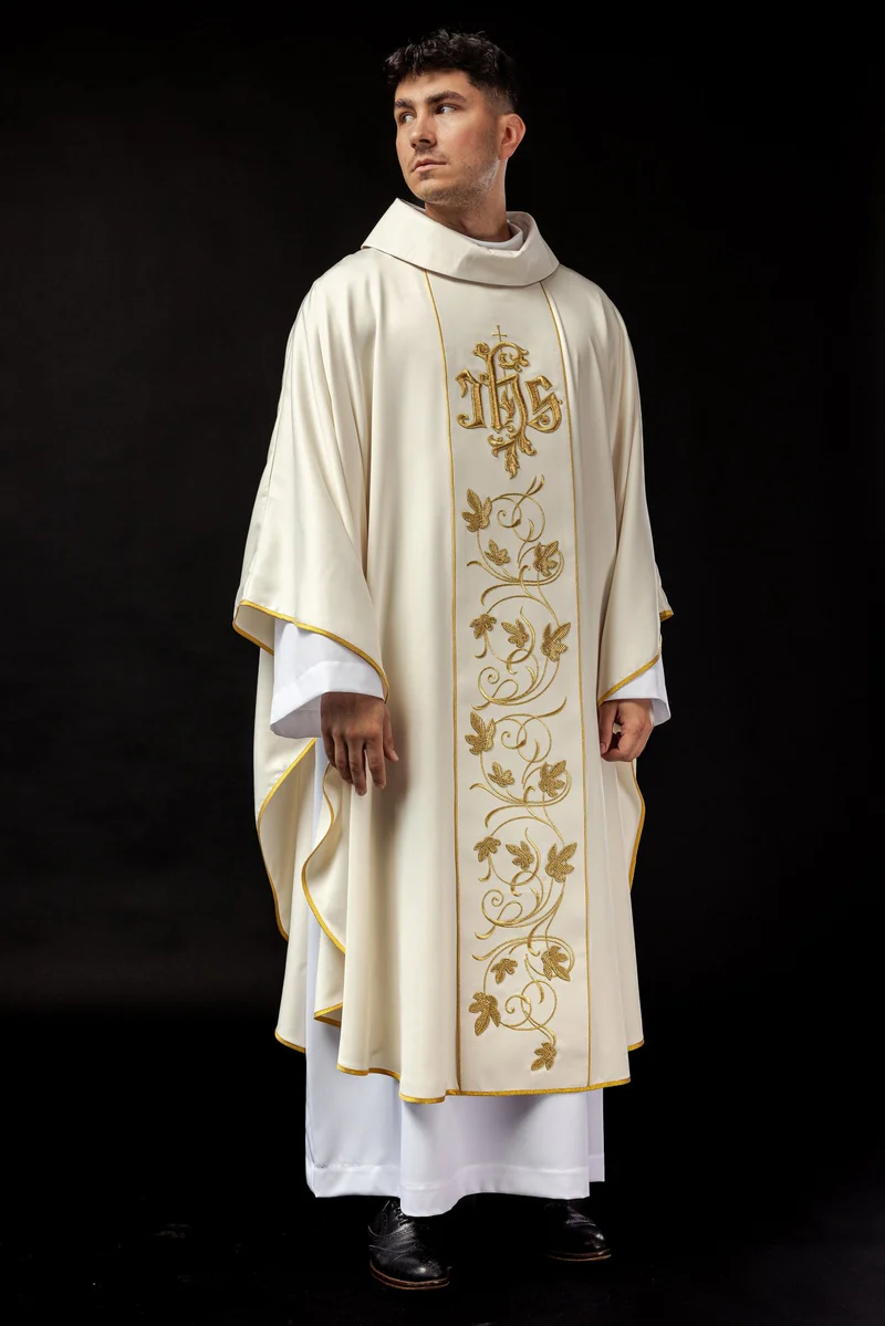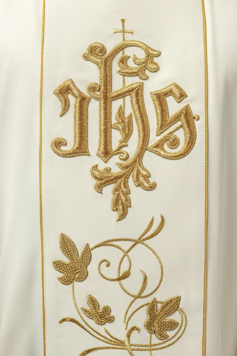 Bogato zdobiony pas z motywem florystycznym i symbolem IHS stanowi wyjątkowy element zdobniczy.