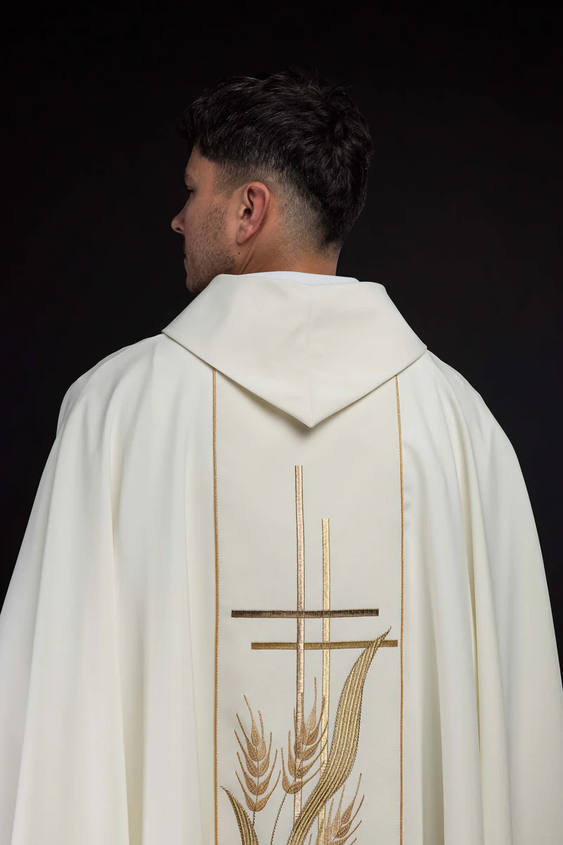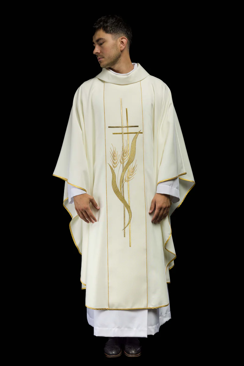 Szata liturgiczna z pasem zdobiony haftem w kolorze złotym. Wykonany z wysokiej jakości tkaniny gładkiej.