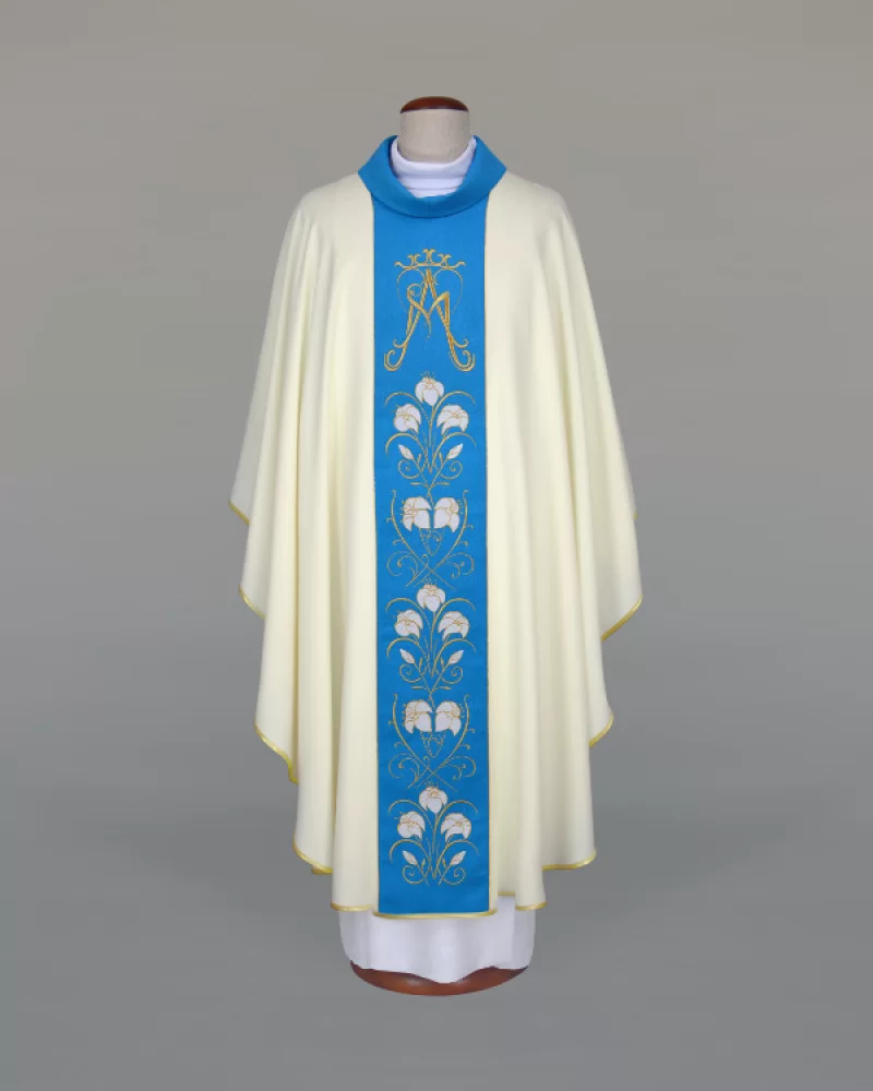 Ornat Maryjny w kolorze ecru zdobiony haftem wykonanym na błękitnym pasie. Kołnierz typu golf.