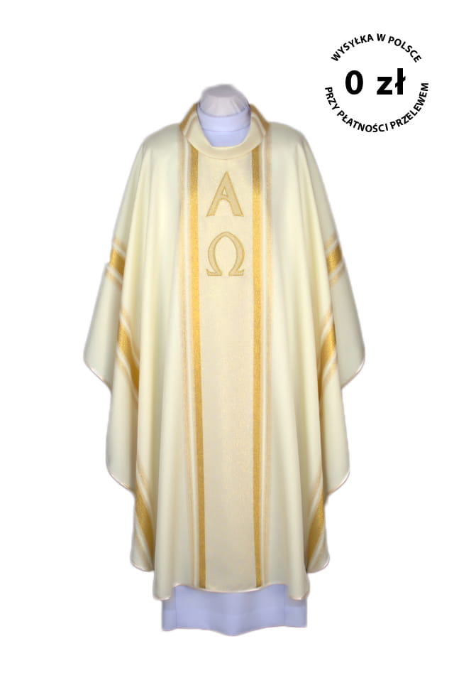 Kremowy ornat z haftem Alfa i Omega.