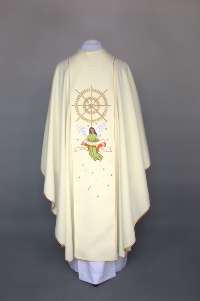 Ornat haftowany komputerowo, wykonany z lekkiej i przewiewnej tkaniny imitującej len. Symbolika - Boże Narodzenie.